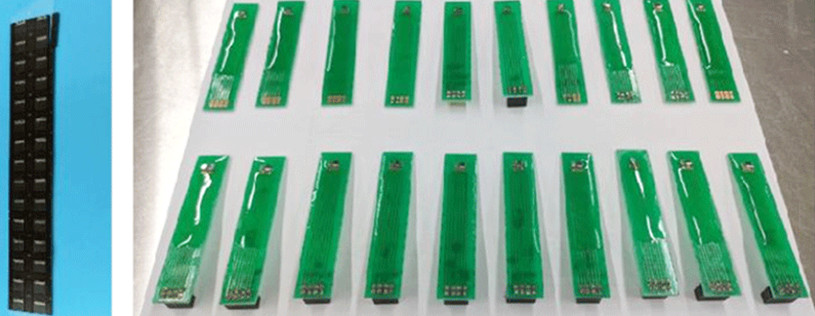 Chip cảm biến pH ISFET (trái) và các đầu đo pH đã gắn cảm biến. Ảnh: NNC