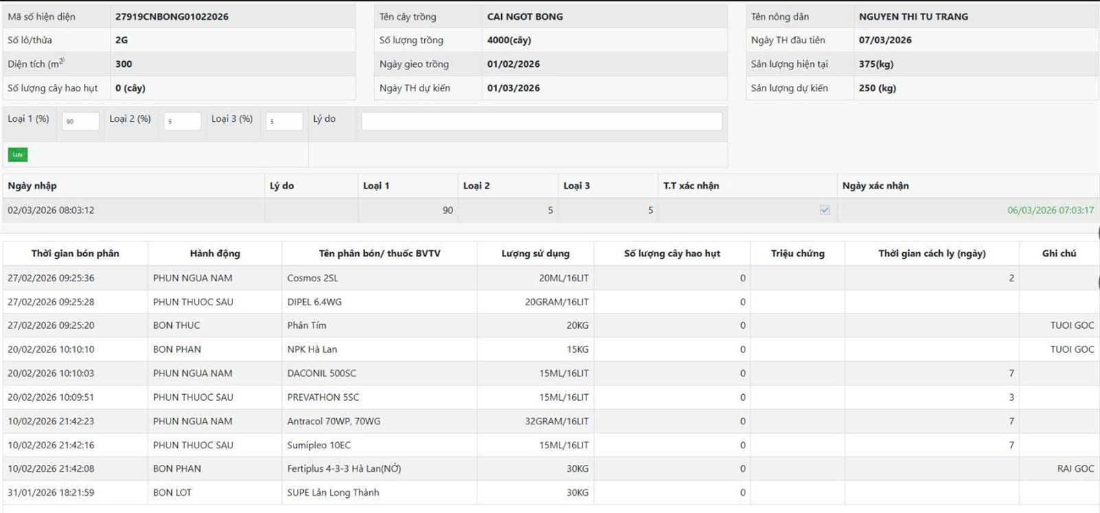 Điểm mạnh nhất của chuyển đổi số chính là sự chi tiết. Mọi hoạt động từ ngày gieo trồng, dự kiến thu hoạch đến từng lần bón phân đều được số hóa minh bạch.