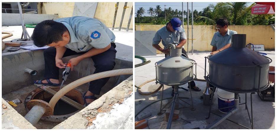 Hình: kiểm định viên Trung tâm TĐC thực hiện kiểm định bể đong cố định (lập barem bồn)
