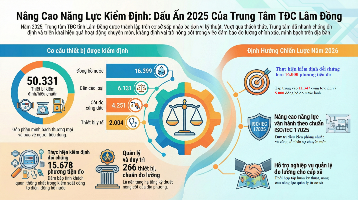 Trong năm 2025, Trung tâm Kỹ thuật Tiêu chuẩn Đo lường Chất lượng tỉnh Lâm Đồng đã triển khai hiệu quả hoạt động kiểm định, hiệu chuẩn, thử nghiệm trên toàn địa bàn tỉnh, góp phần quan trọng vào việc minh bạch hóa các giao dịch thương mại, đảm bảo chất lượng hoạt động sản xuất – kinh doanh và bảo vệ quyền lợi người tiêu dùng. Trung tâm đã thực hiện kiểm định đối chứng phương tiện đo, bao gồm công tơ điện và đồng hồ nước, theo đúng quy định và sự chỉ định của Ủy ban Tiêu chuẩn Đo lường Chất lượng Quốc gia. Hoạt động này không chỉ góp phần phát hiện kịp thời các sai lệch kỹ thuật của phương tiện đo đang sử dụng mà còn là công cụ kỹ thuật quan trọng giúp cơ quan quản lý đánh giá chính xác tình trạng phương tiện đo, bảo đảm độ tin cậy của kết quả đo và quyền lợi hợp pháp của người tiêu dùng, đặc biệt trong các lĩnh vực thiết yếu như điện và nước. Hoạt động dịch vụ về kiểm định và hiệu chuẩn của Trung tâm trong năm 2025 còn tập trung vào nhiều nhóm phương tiện đo thiết yếu, phục vụ trực tiếp các lĩnh vực sản xuất, thương mại và y tế.
