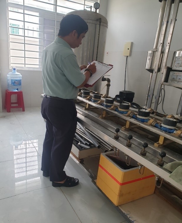 Kiểm định viên thực hiện kiểm định đối chứng đồng hồ đo nước lạnh