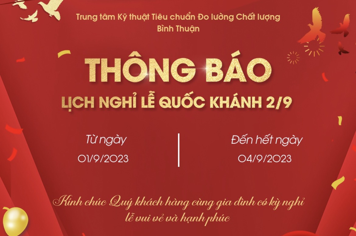 Trung tâm Kỹ thuật Tiêu chuẩn Đo lường Chất lượng Bình Thuận Trân trọng thông báo lịch nghỉ Lễ Quốc khánh như sau: