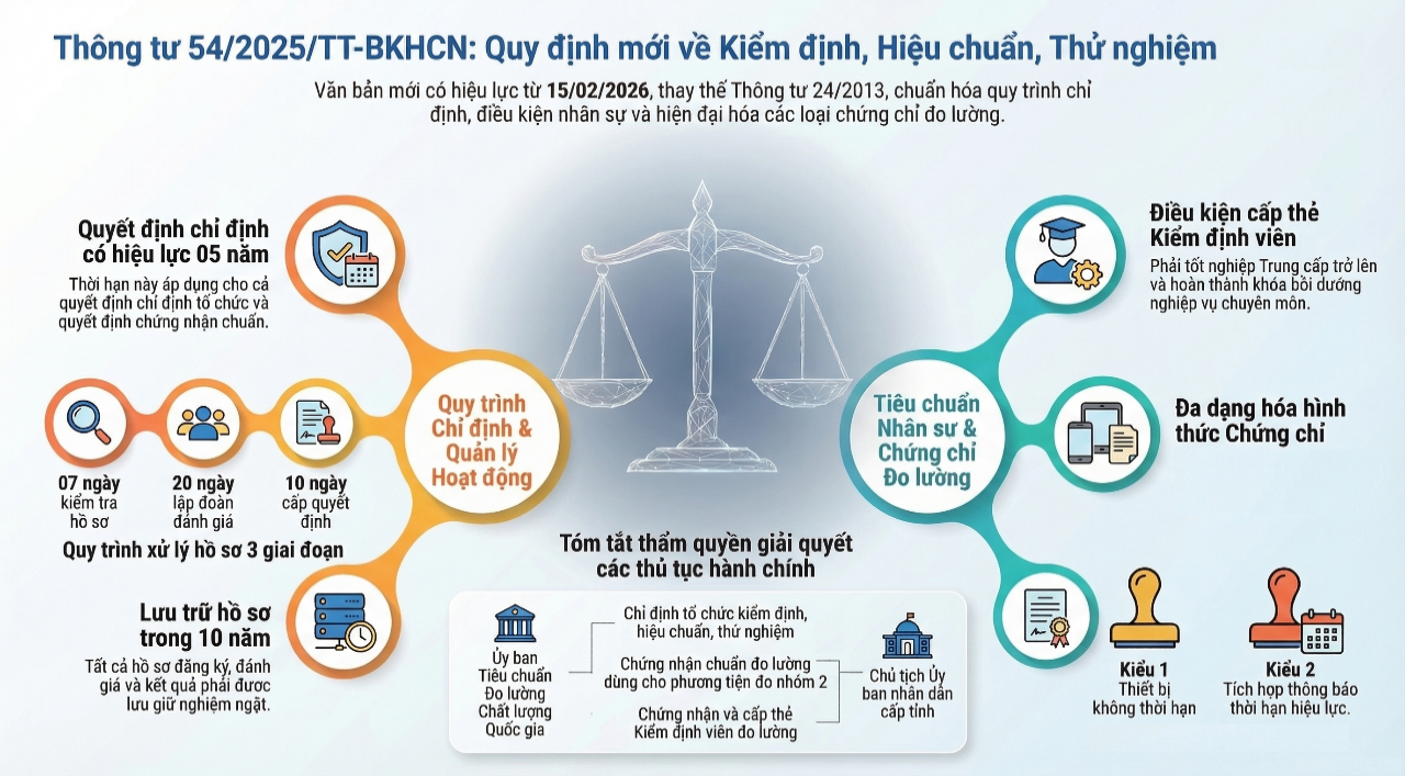 Thông tư số 54/2025/TT-BKHCN ngày 31/12/2025 quy định về hoạt động kiểm định, hiệu chuẩn, thử nghiệm phương tiện đo và chuẩn đo lường, được ban hành nhằm thống nhất hệ thống quy định pháp lý, nâng cao hiệu lực quản lý nhà nước trong lĩnh vực đo lường.